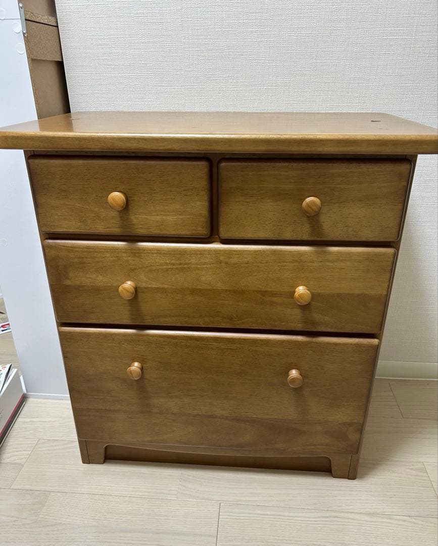 - 出産準備で購入しました。タンス自体はしっかりしていて満足です。取っ手はすべてクリスタルクリアにしました。取っ手のネジの中央がズレているものがあった為、取付けた際にタンスに傷が付いたのが残念です。