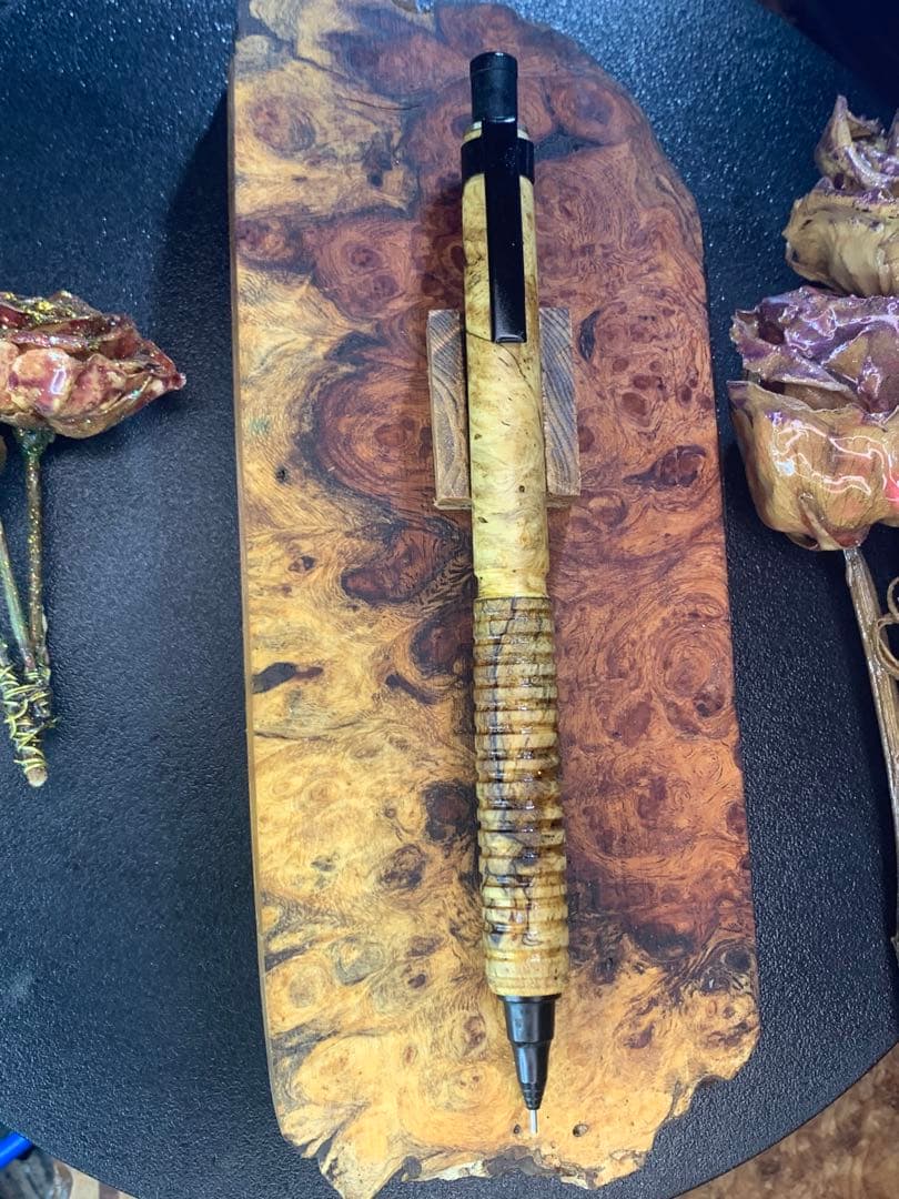 カラー···レッド柄・デザイン···ストライプ素材···木種類···ペン・筆記用具チューリップウッドです細身のシャープペンシル作ってみました。チューリップウッドは固く粘り強い素材だと感じました、黒檀や紫檀などは削りカスが粉々に成りますが、ある程度形が残る感じで削れていきます勿論バイトの感じは硬い物を削ってる感覚があるので紫檀などと緻密さは変わらないと思います。硬い素材の良いところは、磨けば磨くほど艶が出る事ですそして、長年使っていく程に味が出る事でしょうか。
